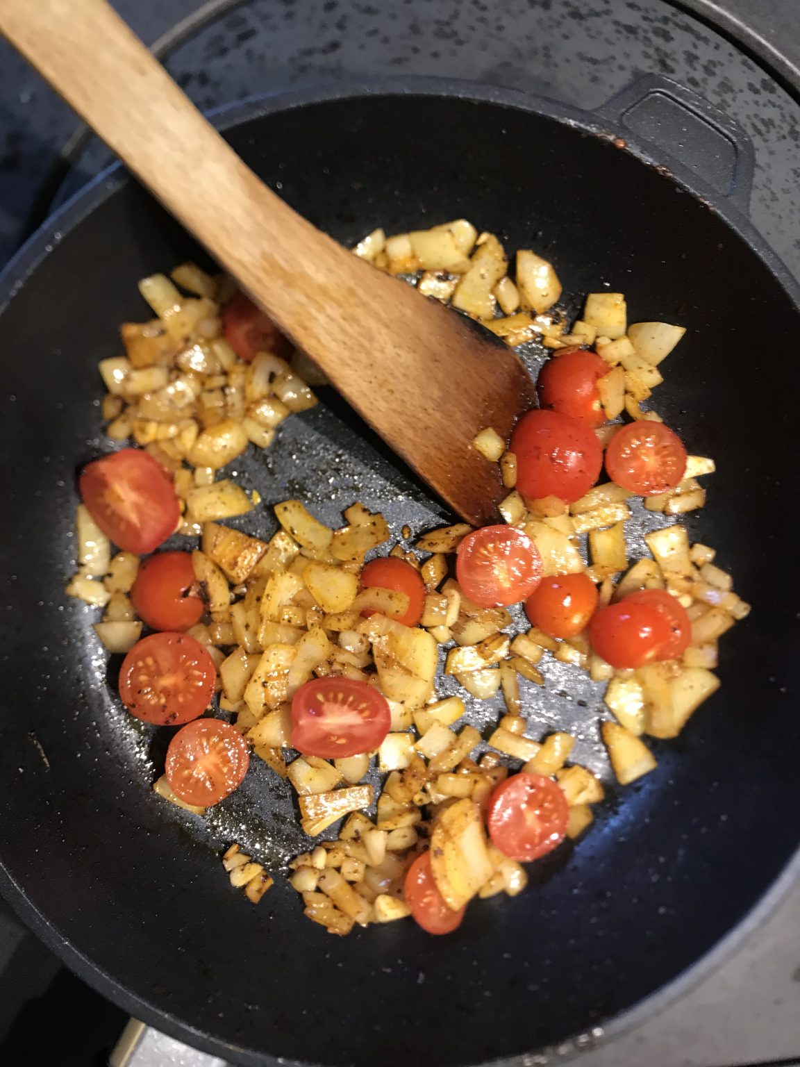 - Stir in the tomatoes and tomato purée, allowing them to break down into a thick sauce.
